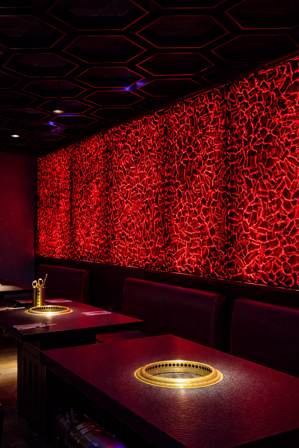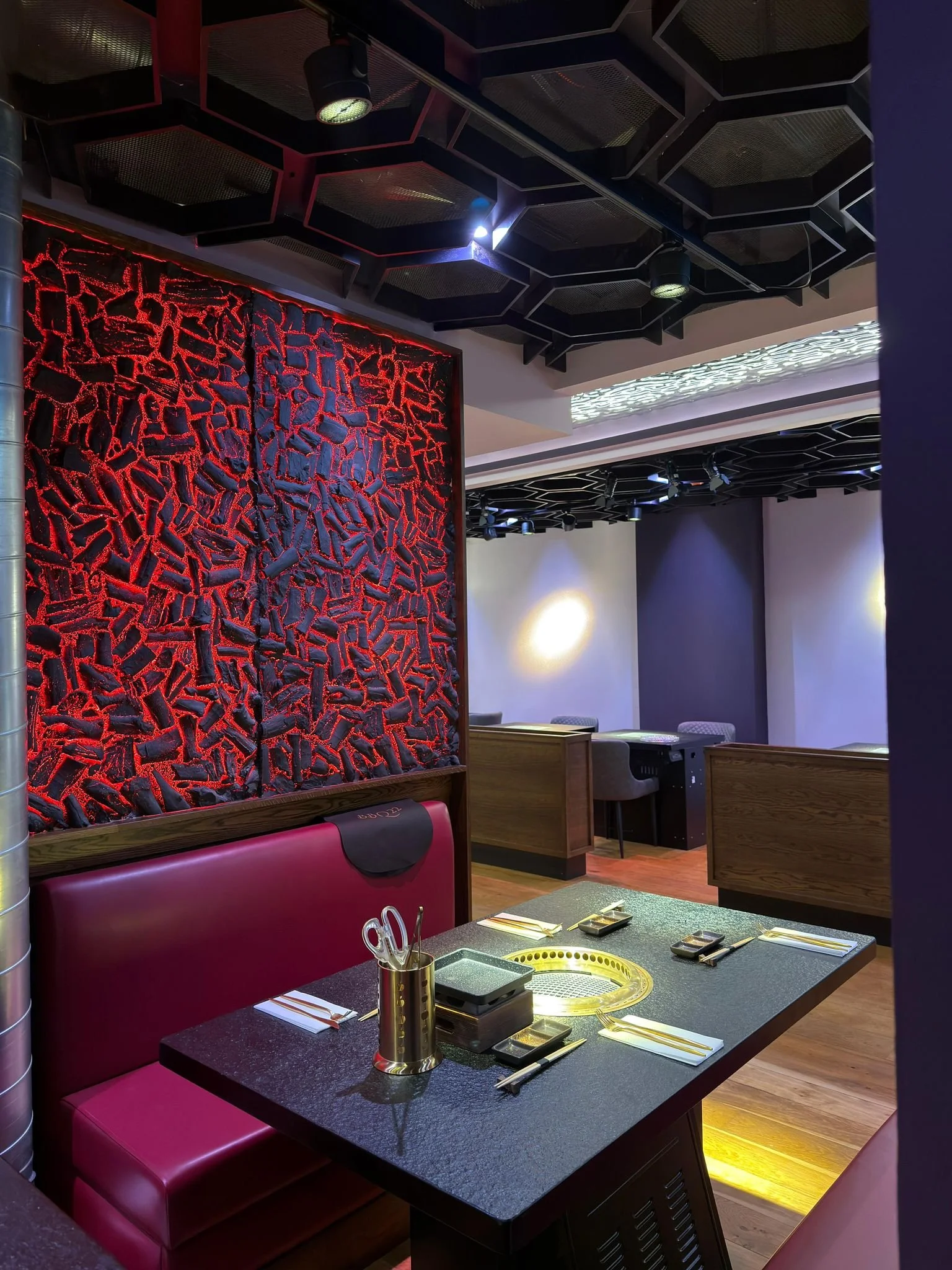 Located above The Dumpling Library, the project introduced a distinctive fit-out centred around the practical and visual requirements of tableside Korean barbecue dining. The layout, seating arrangements and integrated grill stations all needed to work seamlessly within a refined interior setting, balancing durability with a high-end finish.